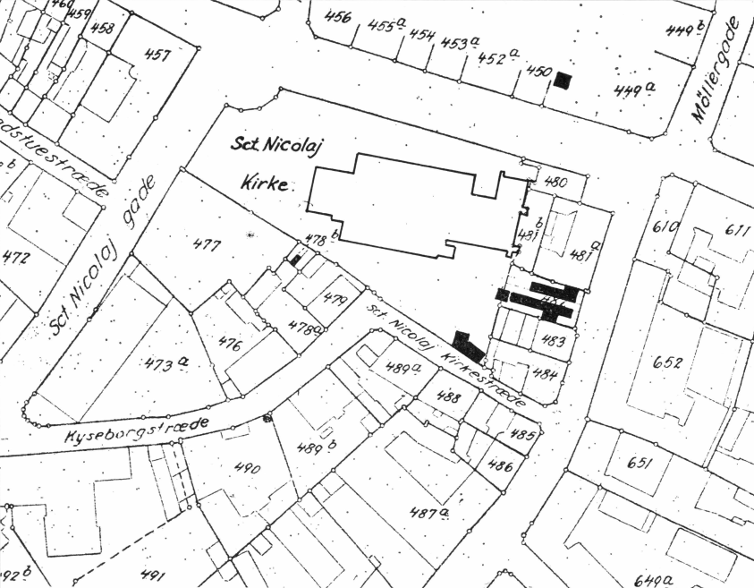 Mandag den 2. juli åbnedes to søgegrøfter på matr. nr. 482 – lige sydøst for Nikolai kirke – se udsnit af matrikelkort, fig. 3. Dette grundstykke – tidligere Korsgade 4 – er nu inddraget i Skt. Nikolai kirkeplads, efter at ejendommen blev nedrevet i begyndelsen af vort århundrede.