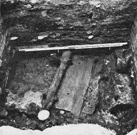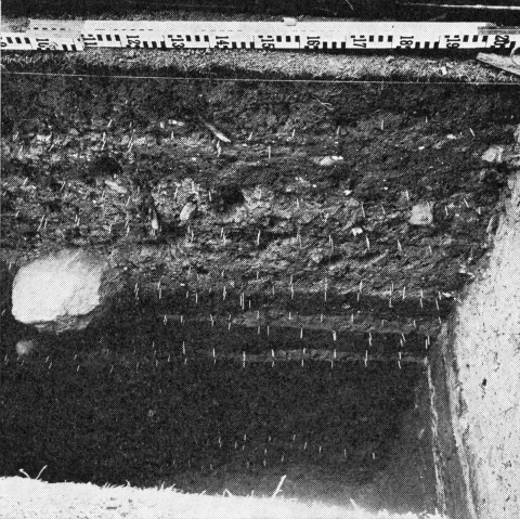 På gårdspladsen lå indtil januar 1971 en køn bindingsværksbygning med svalegang, opført i begyndelsen af 1600-tallet (fig. 13). Huset havde ikke kælder, så vi havde mulighed for at grave i rene middelalderlag – som viste sig at være ca. 3 meter tykke. Fundenes antal og tilstand var som på matr. nr. 482. Måske har der på et tidspunkt ligget et garveri, idet flere af lagene indeholdt koncentrationer af læsket kalk – i et par tilfælde endda opbevaret i stærkt ødelagte tønder, fremstillet af bøg.