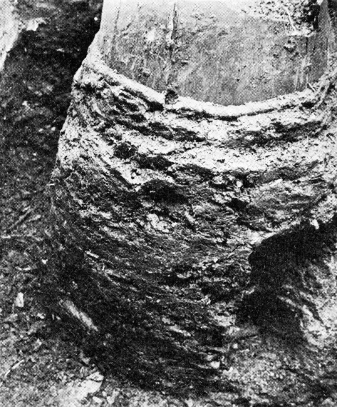 Begge de nævnte metoder fandt anvendelse, alt efter udgravningsforholdene. Under opfyldningslaget konstateredes et større sammenhængende lerstampet gulv. Både dette gulv og 3 dybere liggende – og altså ældre – gulvlag var spækket med måltidsrester: æggeskaller, frø, fiskeknogler, – ja sågar fiskeskæl – knogler fra små pattedyr og fugle, foruden en hel del skår af keramik og stentøj. Endelig var et par af gulvene, der oprindelig havde haft det gule lers farve, kulsorte af aske og andet affald. Vi er endnu ikke helt sikre på, om de kraftige askelag evt. indicerer, at huset har været hærget af ildebrand. Vidnesbyrd om sådanne katastrofer blev iagttaget ved flere af de ældre middelalderlige husfaser, der simpelthen var dækket med trækul, og masser af brændt lerklining, hvori der ofte sad rester af strå (fig. 9).