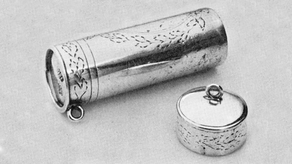 På fig. 6 vises to samtidige, mindre korpusarbejder, nemlig en sennepskande og en peberbøsse.[106] Begge stykker er stemplet på soklens ene side med bymærke og Theilgaards tredie mesterstempel. Ingen af tingene er dateret. Peberbøssen har dog indprikket initialerne „H. W.“ og „K. W.“ oven på fodstykket. Begge genstande har vaseformet krop og en enkelt profileret fod på en kvadratisk sokkel. Overdelen er naturligvis forskellig. Sennepskanden er forsynet med en spinkel hank smykket med en perlerække. Indvendig og langs kanterne mellem låg og krop er den forgyldt. Peberbøssens huller er ordnet i et graveret net.