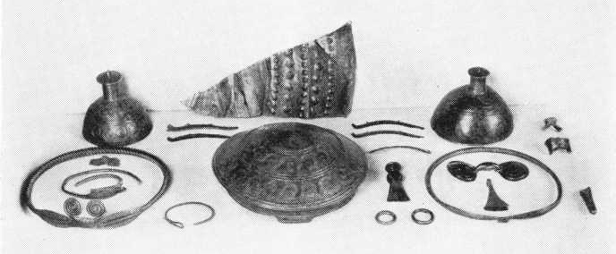For at læseren kan få et klart billede af alle de genstande, som fundet rummer, skal i det følgende ganske kort opregnes de øvrige hele sager og brudstykker, idet der henvises til fig. 1: 4 buede kornsegle med rygtappe til anbringelse i det buede skæfte, 1 »brillebøjlenål« og 1 pincet (begge inden i ringen til højre), 1 lille økse af sjælden form, 2 små hule ringe og endnu et brudstykke af en snoet halsring (mellem bæltekarret og ringen til højre), 1 fra Mellemeuropa indført stykke beslagblik til et bælte med linier af udrevne bukler, fig. 4, samt 2 støbeknolde og brudstykket af en ornamenteret dopsko til en spydstage (længst til højre på billedet). Efter finderens opgivende lå alle småsagerne under den store bæltedåse, som lå i omvendt stilling med mundingen nedad, mens de to store halsringe skal have ligget oven på bæltedåsen. Det forekom ham, at tingene under bæltedåsen var pakkede ind i græs. Af dette græs, som har kunnet bevares, fordi det er gennemtrukket af bronzeir, er der medtaget en prøve til museet.