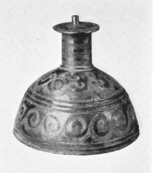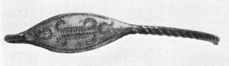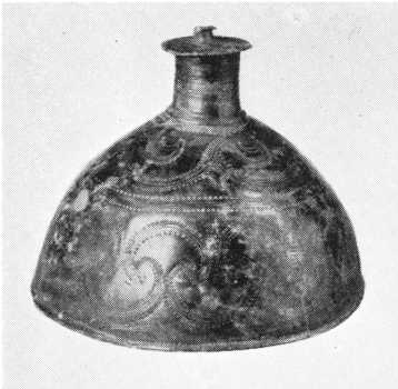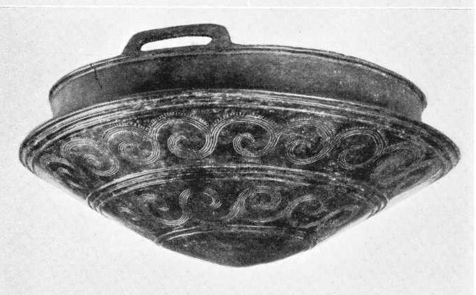Først ser vi på to af fundets andre genstande, som også let falder i øjnene. Det er de to mærkelige, halvkugleformede stykker fig. 2 a-b, fra hvis midte en hul, cylindrisk top skyder frem øverst afsluttet af en cirkelrund skive. Som det ses, er også disse to smykker prydet med rig linieornamentik i datidens stil. Indvendigt er de hule, idet siderne består af sværtstøbt bronzeblik. Faststøbt på indersiden i den ene side findes rester af den knap, på hvilken bæltets ene ende fæstnedes, mens den anden ende fastgjordes i en øsken overfor. Måske har da denne hvælvede »bælteplade«, som er en typologisk udvikling af den ældre bronzealders flade bælteplade (se den foregående artikel) siddet foran på bæltet ved midiemidten.