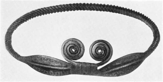 Fundet omfatter tillige ringpynt, både hals- og armringe. Den største og smukkeste er halsringen, fig. 3, gjort af en kraftigt snoet bronzestang, der ved begge ender er støbt ud i lancetformede plader med en fremspringende midtvulst kantet på begge sider med flerdobbelte prydbuer. Pladerne tyndes ud i svær bronzetråd, der er rullet op i store dekorative spiraler, således at de to ringender kan danne et lukke ved at gribe ind over hinanden. Ringen må engang være brækket på dette skrøbelige sted, og man har da repareret den ved at støbe en kappe ind over brudstedet. På fig. 3 ses det, at man har pyntet på stedet med lodrette felter af indpunslede linier. En anden halsring, til højre på fig. 1, er af samme hovedtype, men fattes det smukke spirallukke. Af en tredie ring foreligger kun fire brudstykker, det ene er ringenden, hvis plade er gengivet på fig. 4; den er prydet med skibsfigurer i den yngre bronzealders stil. Endelig er af en armring bevaret det lille, spinkle stykke, som ses på fig. 1 mellem den store ring til venstre og bæltekarret.