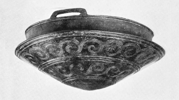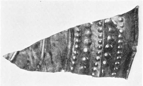 Endnu er ikke nævnt et brudstykke, som påkalder en særlig opmærksomhed. Det er den på fig. 5 gengivne del af et bronzeskjold. Bevaret er et udsnit fra midten ud til randen. Skjoldet har ikke været støbt, men er som de fleste af de tilsvarende få eksemplarer, der kendes fra Danmark, fremstillet i drivningsteknik, og man ser da også tydeligt på bagsiden arrene af hammerslagene. Det tynde bronzeblik er opdelt i koncentriske bælter adskilte ved uddrevne lister og rækker af bukler. Randpartiet har været bøjet om en tyk bronzetråd til styrkelse af kanten. Af de otte lignende skjolde, som kendes fra Danmark, er nogle cirkelrunde, andre ovale, men vort stykke tillader på grund af bevaringstilstanden ingen sikker slutning om dets oprindelige form. Dog tør det formodes, ud fra forløbet af den inderste vulst, at det nærmest er et eksemplar af den ovale type.