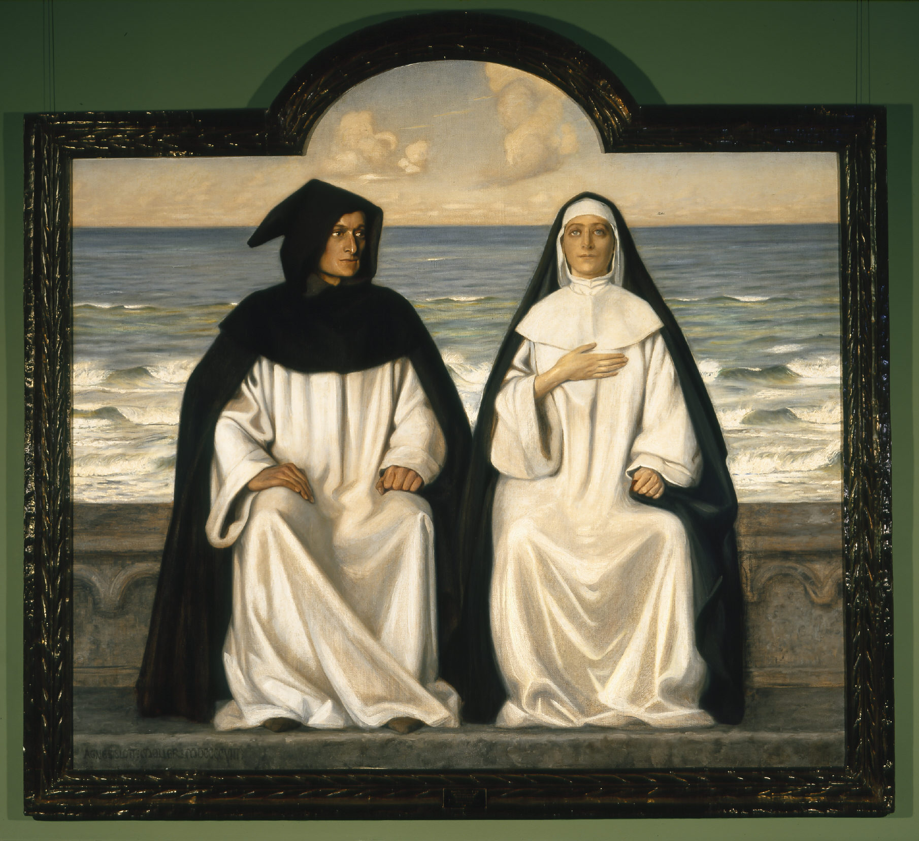 4. ^ Agnes Slott-Møller beskriver i sine erindringer, Folkevisebilleder fra 1923 visen om Kong Valdemar Sejrs søster, Liden Kirsten og Prins Buris, der elskede hinanden, men kongen ville ikke lade dem få hinanden. Mens Kongen var på korstog var de to elskende sammen og netop dagen, hvor kongen vendte tilbage, fødte Kirsten et barn. Som straf dræbte Kongen sin søster, og af anger lod han hende begrave på Vestervig kirkegård og gav klosteret på stedet alt hendes gods. Prins Buris blev ved sin død begravet ved hendes side. Agnes Slott-Møller har taget den eneste bevarede indskrift fra stenen, hvor de ligger begravet, og brugt som titel på billedet. Hun afbillede de to som munk og nonne ud fra sin tolkning af folkeviserne om Prins Buris og Liden Kirsten.
