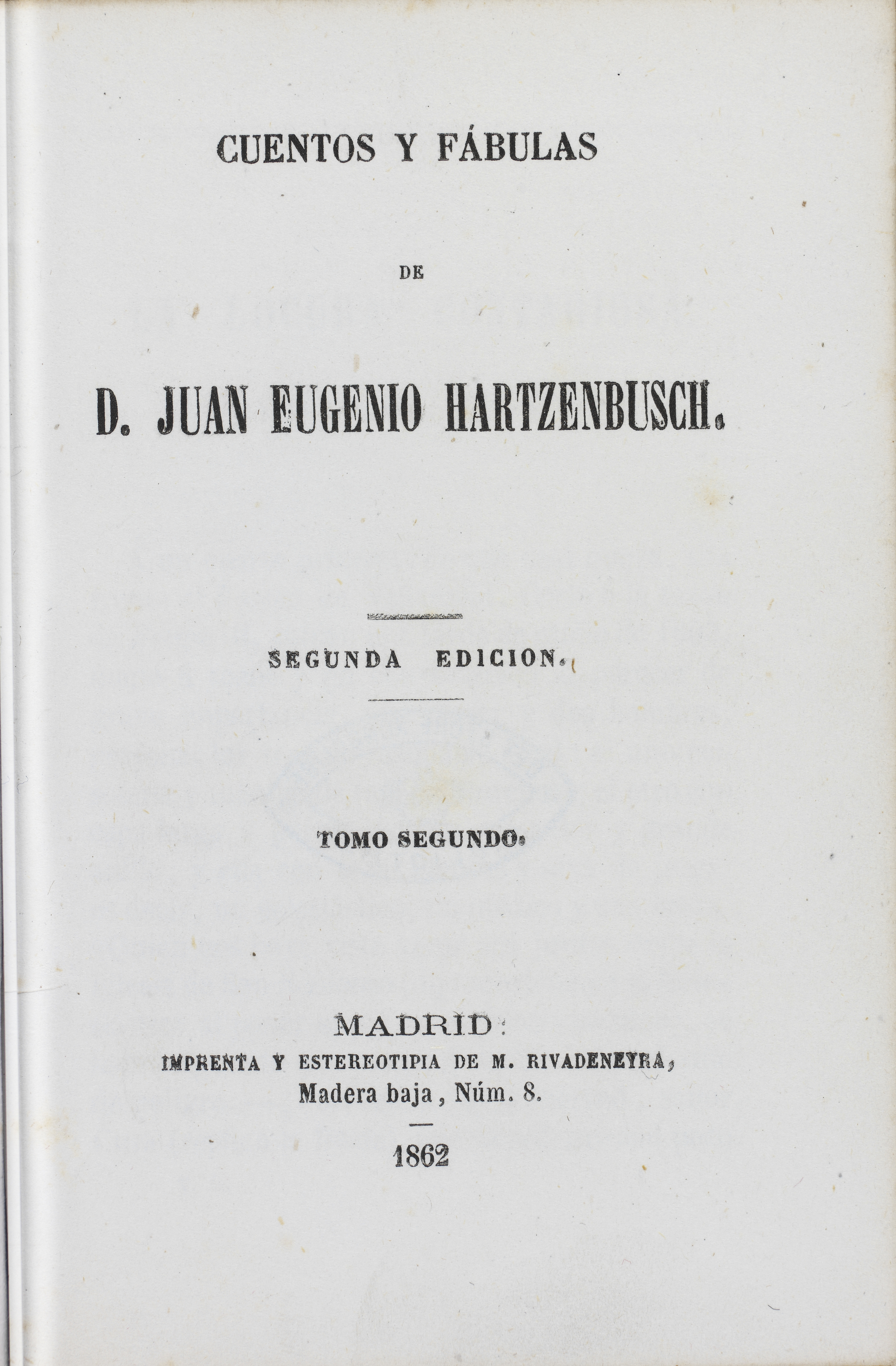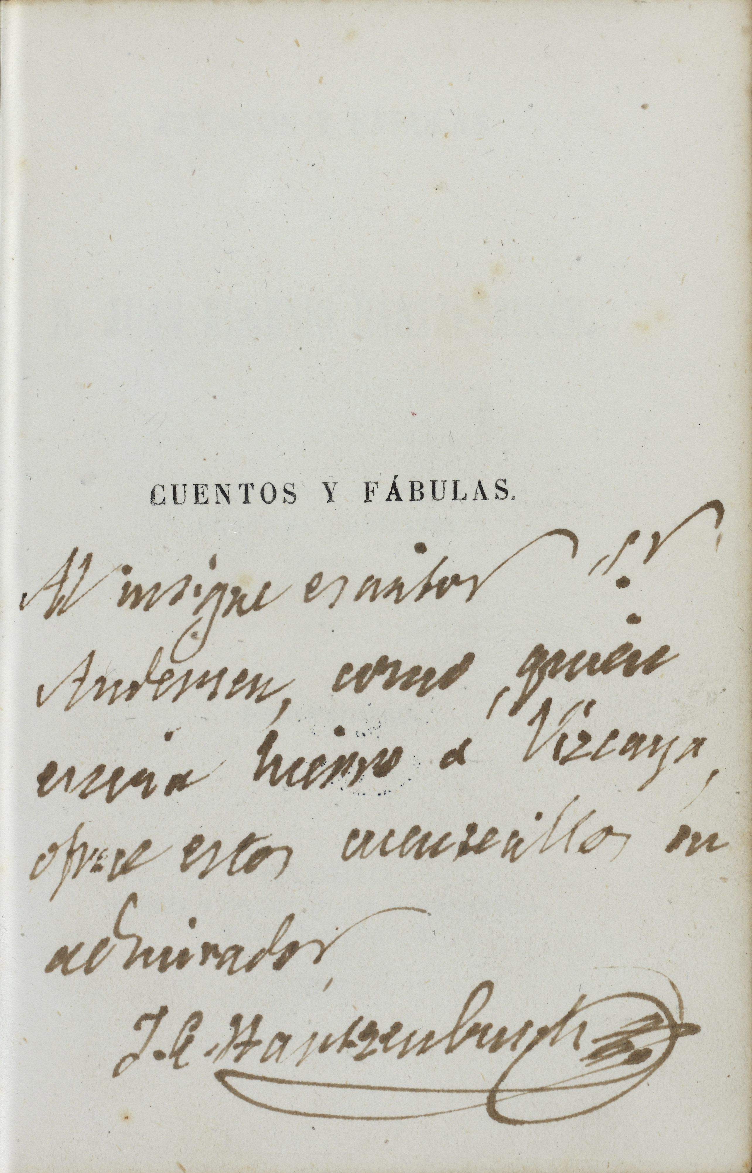 Digteren og litteraturhistorikeren Juan Eugenio de Hartzenbusch, mest kendt uden for Spanien for sine Cuentos y fábulas, skrev også historiske romaner og skuespil. Han var en af Spaniens få anerkendte romantiske forfattere. Født i 1806 var han jævnaldrende med Andersen. Faderen var tysk, og sønnen beherskede dette sprog, hvilket tilsammen med deres fælles interesse for fortællekunsten burde have kunnet dannet grundlag for et nærmere bekendtskab mellem de to mænd. Den lærde og af væsen beskedne spanier tog vel imod den danske digter. “… han var ret venlig,” skriver Andersen, “sagde at han kjendte mit Navn, men ikke mine Skrifter, forærede mig derpaa sine Cuentos y Fabulas to smaa Bind” (28.11). Disse bind med Hartzenbusch’s dedikation til Andersen findes nu på Det kgl. Bibliotek i København. I mangel af mere spændende detaljer at fortælle om giver Andersen følgende skildring af Hartzenbusch: “en venlig ældre Mand, der min-de[de] lidt om Worsaae, og loe ved hvert tredie Ord, men lo uden Smiil” (28.11) Hvordan mødet i øvrigt forløb, fortæller dagbogen intet om, men det kommer frem i rejsebeskrivelsen: “Det var en glæde at høre ham med hele den sydlige Ildfuldhed tale om Poesi og Kunst” (R&R VII, s. 333).