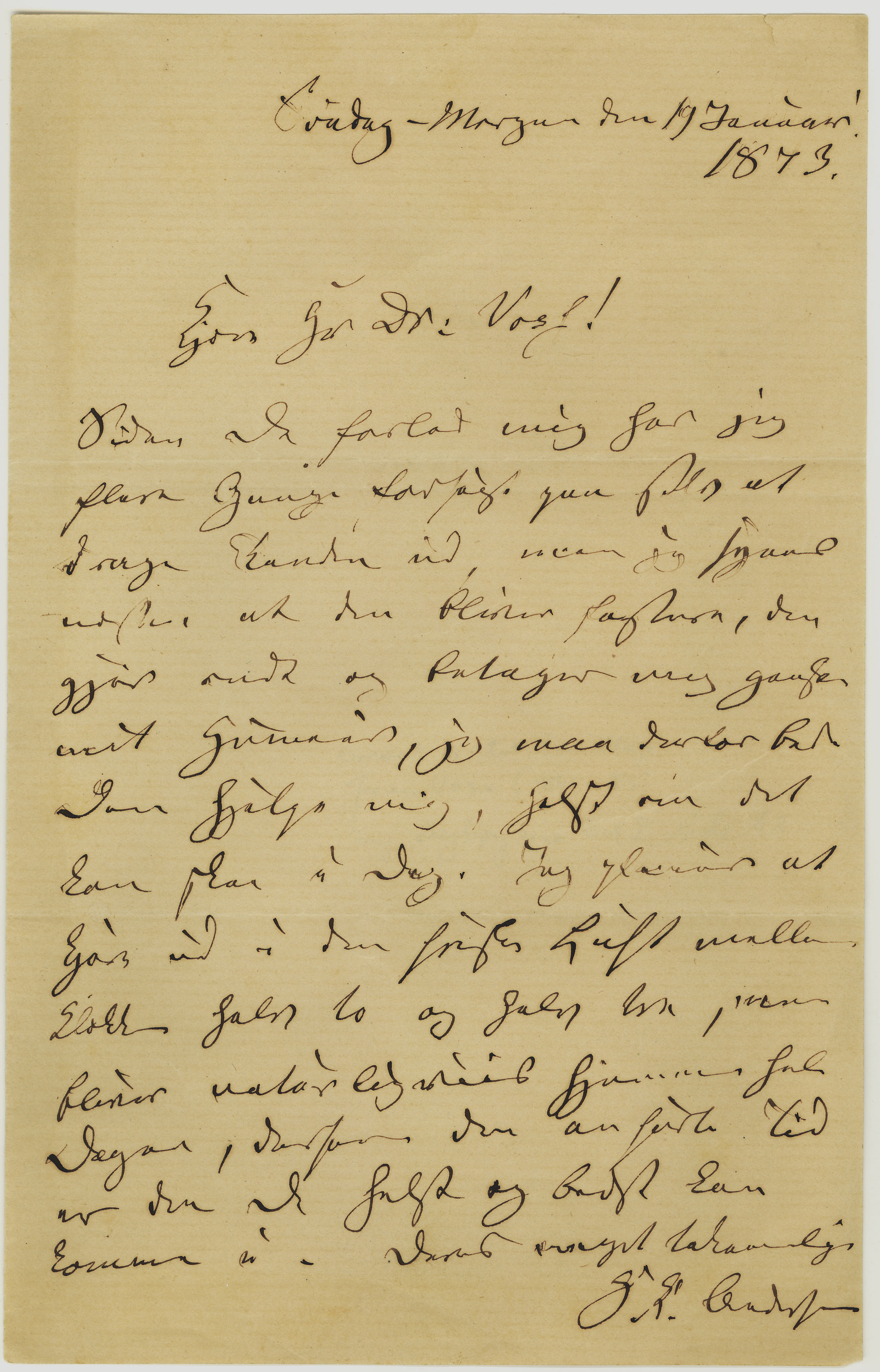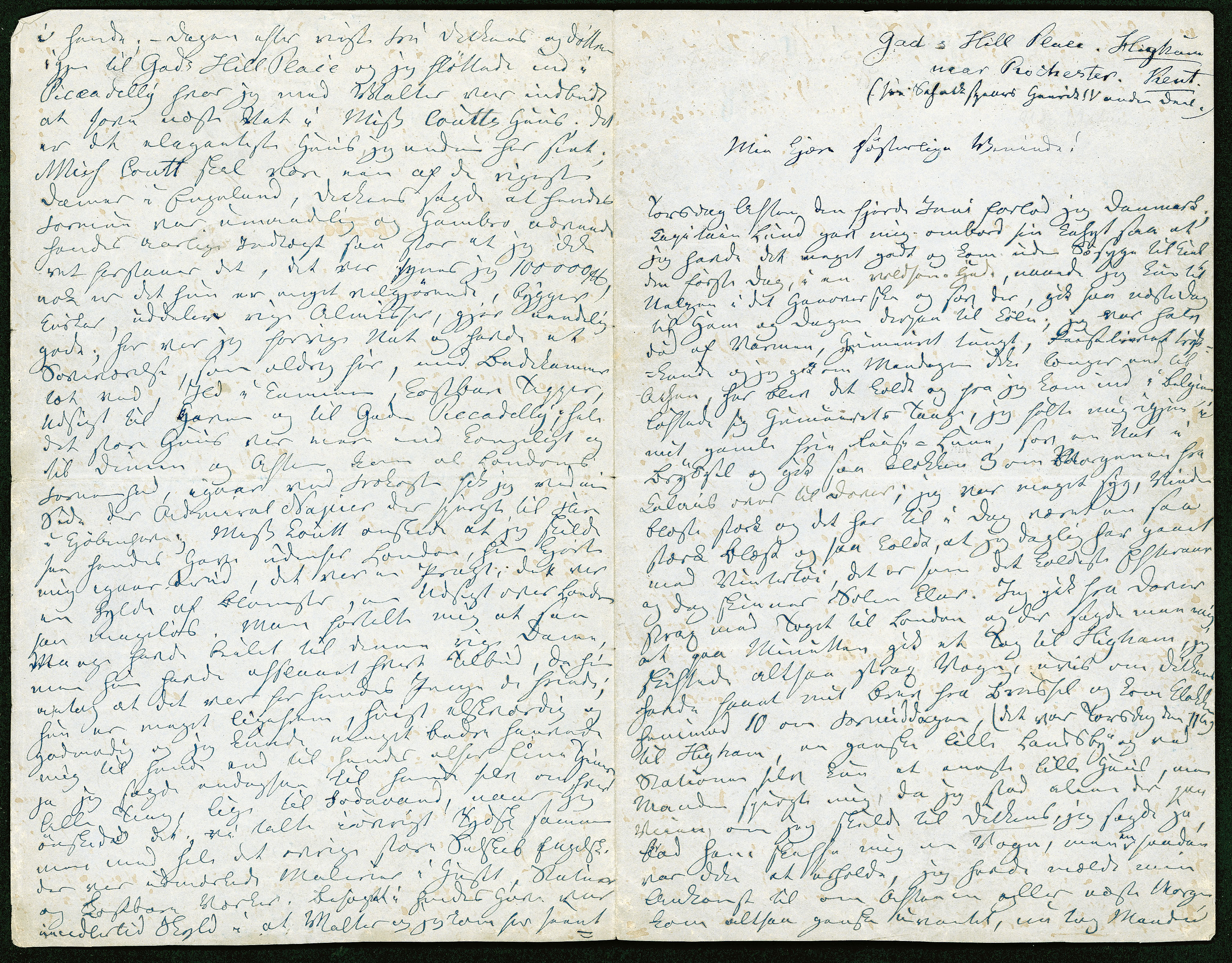 Med støtte fra Kulturarvsstyrelsen lykkedes det museet i slutningen af sidste år at erhverve et seks sider langt brev fra H.C. Andersen til veninden Henriette Wulff fra den 18. juni 1857. Brevet var særdeles attraktivt, fordi det blev skrevet under digterens ophold hos Charles Dickens på dennes nyerhvervede landsted Gad’s Hill Place, beliggende ved hovedvejen mellem Rochester og Gravesend. Venskabet mellem de store forfattere Charles Dickens og H.C. Andersen er et særdeles interessant emne, derudover var en anden stærk grund til erhvervelsen også, at den mægtige og næsten komplette brevveksling mellem digteren og Henriette Wulff, der befinder sig i offentligt eje, manglede netop dette brev. Ordlyden var ikke ukendt. I den imponerende udgave af brevvekslingen mellem Henriette Wulff og H.C. Andersen, som den store H.C. Andersen forsker Helge Topsøe-Jensen stod for i 1959, findes brevet gengivet, men overraskende nok med den note, at brevet tilhørte H.C. Andersens Hus i Odense. Det hører i sandhed til sjældenhederne at finde en fejl i den uhyre grundige Topsøe-Jensens arbejder, her var der imidlertid en løjerlig én, men pudsigt nok også en fejl, som tiden kunne rette op på igen. For nu er brevet kommet i museets eje, Topsøe-Jensen fik efter 45 år alligevel ret, og vi er lykkelige over erhvervelsen. Men nu til selve brevet: I sommeren 1856 modtog H.C. Andersen et hjerteligt brev fra Charles Dickens, hvori han på det varmeste tilskyndede Andersen at komme til England igen: “You ought to come to me … and stay in my house. We would all do our best to make you happy.” Samtidig kunne Dickens berette, at han var i færd med at skrive Little Dorrit, og at dette arbejde nok ville fængsle ham for de næste ni til ti måneder. Nok derfor svarede H.C. Andersen først på Dickens’ brev i marts 1857 og takkede ja til invitationen. Rejseplaner blev lagt. I slutningen af maj forlod digteren Danmark og fra Brüssel lyder det i et brev til Dickens: “ … jeg længes som et Barn efter at række Dem Haanden, gjensee Dem Ansigt til Ansigt, være hos Dem og Deres en kort, lykkelig Tid … Mit Ophold i Engeland er for at see Dem, være meest hos Dem og jeg regner paa at De en 8te a 14 Dage vil beholde mig og at jeg ikke alfor meget generer; bær over mit ringe Sprogtalent ….”