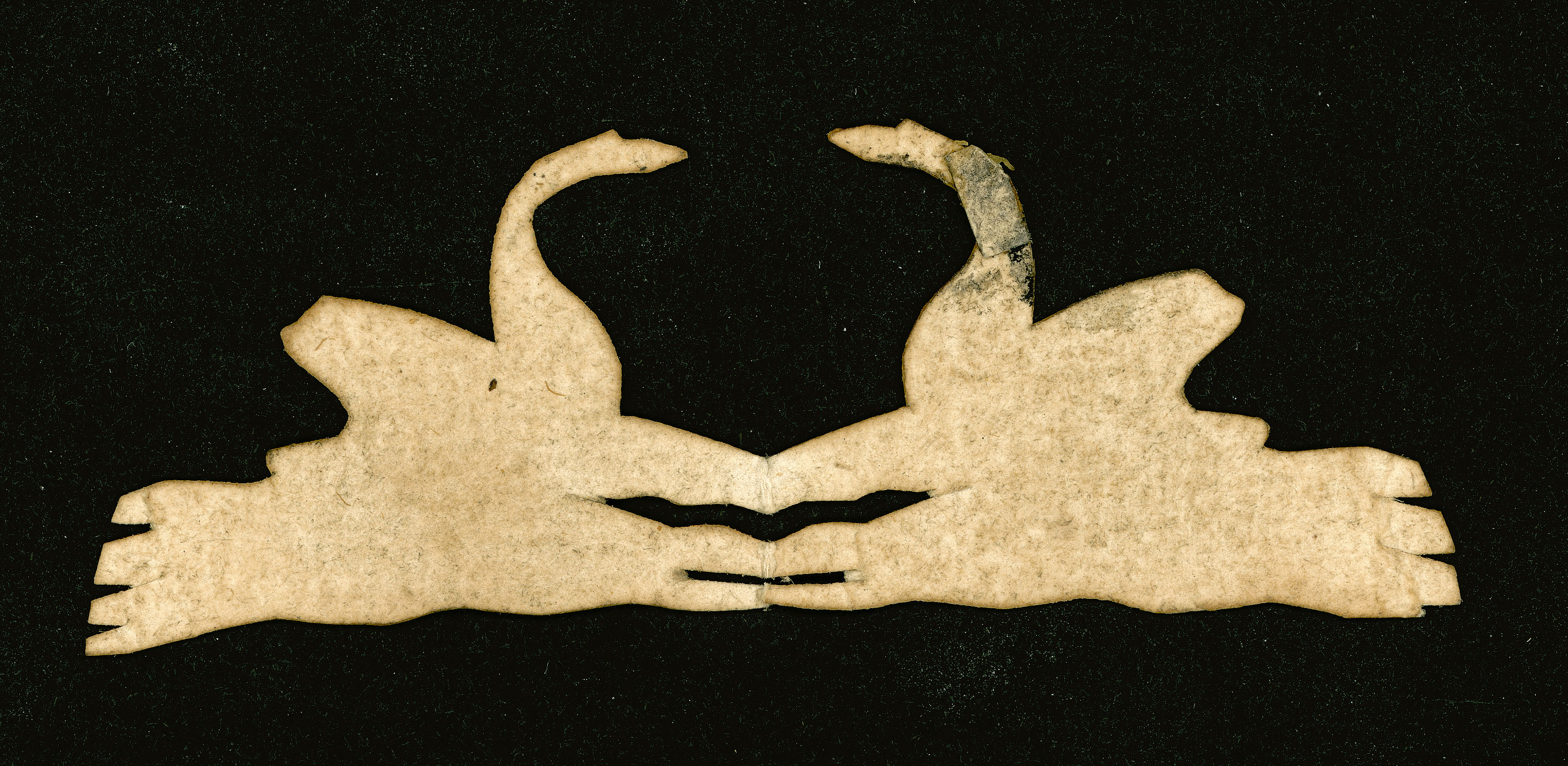 Da Andersen forlod England i 1857, rejste han ikke mod Danmark. Udenlandsrejsen gik videre over Paris og Frankfurt til Dresden, hvorfra han tog ophold på Major Serres gods Maxen. Herhen skal tankerne også gå, for tre nye memorabilia, der knytter sig til familien og dette sted, er kommet i museets eje siden sidst. De to genstande blev doneret til museet i forbindelse med højtideligholdelsen af H.C. Andersens fødselsdag den 2. april 2005, hvorimod den tredje erhvervelse paradoksalt nok næppe kan betragtes som ny. Det kræver en forklaring. I perioden op til 200-års jubilæet modtog museet fra ind- og udland en stribe ansøgninger om udlån af genstande. En af ansøgningerne gjaldt, om man kunne låne en pung, der havde tilhørt digteren. Da museet ligger inde med flere forskellige af H.C. Andersens punge, lod det ikke til at være et problem at låne en af disse ud. Men pungene skulle naturligvis findes frem og undersøges, for et udlån afhænger jo også af bevaringstilstanden. En af pungene lod til at være mere interessant end de øvrige. Ikke blot var den velbevaret, det var også en usædvanlig souvenirpung i den forstand, at den, når man åbnede den, indeholdt et større religiøst stik, man kunne folde ud. Derudover havde H.C. Andersen med blæk skrevet: “H.C. Andersen Maxen 31 Juli 1856”. Denne pung, eller mappe om man vil, blev i sin tid i 1962 af kammersangerinde Else Schøtt foræret museet. Da jeg nu nærmere undersøgte pungen og med pincet åbnede en lille lomme i pungens ene fløj, opdagede jeg en fortykkelse. Skønt det ikke syntes af meget, viste det sig dog alligevel at være noget, der havde fastgjort sig til læderet og antaget dettes farve. Da det blev fisket ud, viste det sig at være et lille papirklip – et lille klip, der endnu ikke var foldet ud. Det var bestemt en fascinerende og stor oplevelse at gøre et sådant arkivfund: Her var et nyt H.C. Andersen-klip, og det var tilmed ikke foldet ud endnu. Motivet var to svaner. Svanen og Maxen synes umiddelbart ikke at rime, men der er dog en sammenhæng. Fru Serre havde i 1855 ført H.C. Andersen højt over Müglitzdalen ved Rabenhorst – til et fjeldparti, der tilhørte godset, hvor han nu skulle læse en af sine historier. Andersen læste “Svanereden”, og fru Serre lod da til erindring indhugge i klippen “Dem Dänischen Schwan d: 11 Juli 1855” og lod endda bogstaverne forgylde. Året efter – og dagen før digteren skrev på sin pung – vandrede han med Serres selskab til selvsamme sted -“Schwanennest”, som stedet nu blev kaldt, til en lille kunstnerisk højtidelighed. Måske har H.C. Andersen, inspireret af denne smigrende hændelse, klippet netop svanemotivet og puttet det i den særegne souvenirpung, – og dér har det så haft sin rede indtil sidste år. Med en gammel museumsmands ord: “De største fund gør man i museernes egne gemmer!”