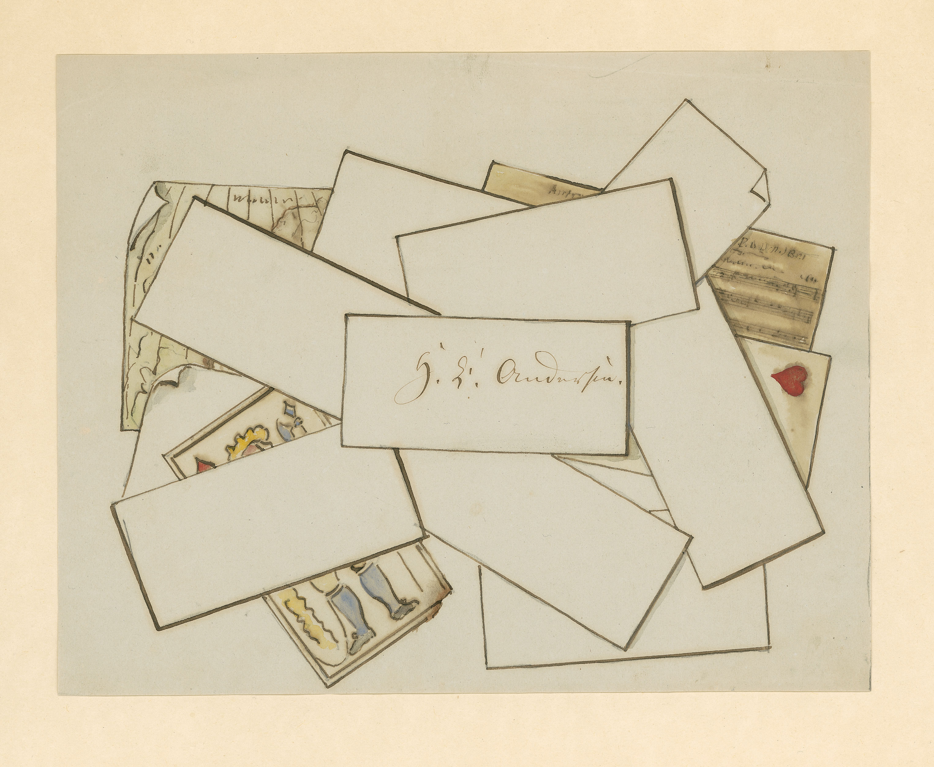 H.C. Andersens bekendtskab med familien Serre stammede helt tilbage til 1838, men det var først i sommeren 1844, at digteren kom til Maxen. Familien Serre var meget gæstfri, og deres hjem dannede hver sommer rammerne for prominente kunstnerkolonier. Venskabet med Serre blev et af H.C. Andersens stærkeste, tyske venskaber, og godset i Maxen blev et af digterens faste opholdssteder i Tyskland i årene 1844-1869. Fru Serre var en stor beundrer af H.C. Andersen, og bevæget af hans tragiske roman, Kun en Spillemand, havde hun taget to fattige drenge, der havde musikalsk geni, til sig for at understøtte deres uddannelse. Også fru Serres selskabsdame, den skotske Margareth Thomas, lærte H.C. Andersen at kende, og en af hendes Andersen-souvenirs er efter en lang og dramatisk provenienshistorie endt i museets samling. Her er der tale om noget så usædvanligt som en håndkoloreret tegning af H.C. Andersen. Den fine tegning blev af H.C. Andersen Samfundet i Odense med støtte fra Møllerens Fond opkøbt af en privat ejer i Berlin og overrakt museet som en gave i anledning af 200-års dagen for H.C. Andersens fødsel. Tegningen adskiller sig fra flertallet af de bevarede Andersen-tegninger – ja, faktisk er det den eneste kolorerede tegning fra Andersens hånd, museet besidder. Her er heller ikke tale om en skitse, men om en omhyggeligt og sirligt udarbejdet tegning, der driller øjet. “Trompe l’oeil” kaldes denne form for tegning, der gennem den naturtro efterligning giver et synsbedrag. I dette tilfælde er det en tegning, der giver sig ud for at være en kollage. Den tegnede kollage er sammenstykket af et Europakort, et nodepartitur, spillekort og små ark af ubeskrevet papir – på nær det i midten, der bærer digterens signatur. Tegningen er ikke dateret, men overraskende nok har museet skitsen til denne trompe l’oeil. På skitsen figurerer ikke alene digterens navn, men også Serres, med angivelse af ægteparrets fødselsdage, samt en dato – den 24. oktober 1860. Den dag befandt digterens sig i Amalienstrasse i Dresden, hvor familien Serre havde deres byejendom. Den kolorerede tegning lader sig derfor på denne måde omtrentlig datere, og endnu en brik i det næsten fuldendte fascinerende Andersen-puslespil kunne lægges.