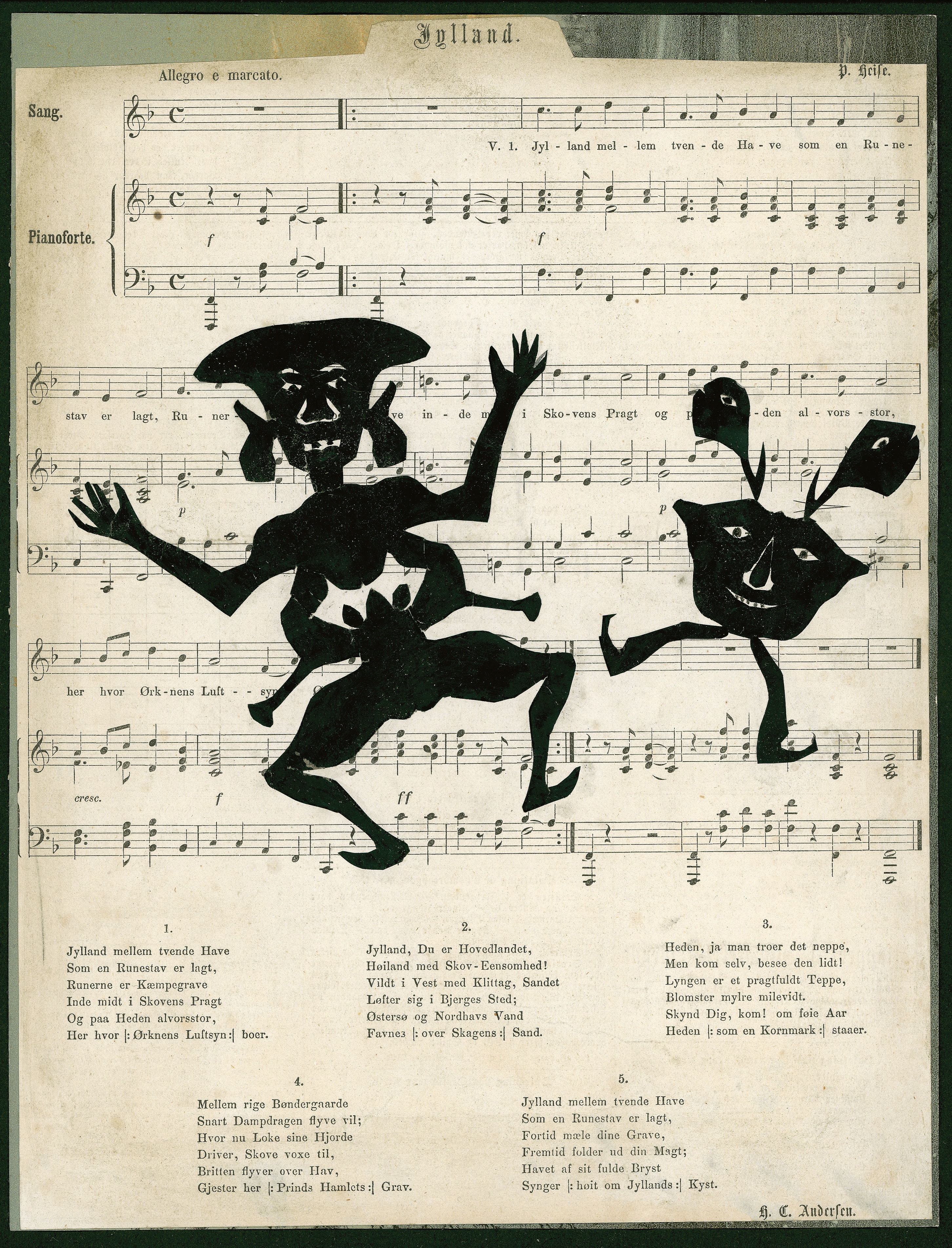 Den sidste erhvervelse, der skal nævnes her i Fynske Minder, er netop dette førstetryk af tekst og noder til digtet “Jylland”. Det blev købt ved auktionen over anderseniana fra Lerchenborg Slot ved Bruun-Rasmussens Auktioner i 2005. Desværre er der ikke knyttet en længere ejerhistorie til trykket; det er forfærdelig ærgerligt, da det er meget usædvanligt: Ovenpå trykket af jyllandssangen er der nemlig klistret to af Andersens klip. Det synes som to glade fantasifostre i dans på nodelinjerne med øjnene som nodehoveder. Dette klip – lige som trompe l’oielen – er et ganske atypisk Andersen-værk, ikke alene størrelsesmæssigt (31 × 24 cm), men også fordi det er en collage eller en montage af to af digterens forskelligartede kunstneriske udtryk: en sang og et klip.