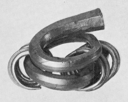 En sådan antagelse må dog stå for sin egen værd, for bevises kan den ikke. Ringe af denne art, med det ruderformet udvidede midtparti, hører imidlertid hjemme i den tidlige vikingetids fund fra ca. 850 til lidt ned forbi 900. Ringen kan udmærket være fremstillet herhjemme. Stempler af nogenlunde tilsvarende udseende kan iagttages på et antal massive bøjleformede sølvarmringe fra de eventyrligt rige skattefund på Gotland tildels hjembragt hid af sveer i østerviking, i Rusland[6]. At mærkerne efter disse stempler, som er ret nært beslægtede med prydelserne på den fynske ring, viser et særtræk af nordisk ornamentik, er der neppe tvivl om. Herefter er det rimeligt at anse guldringen fra Nabbe som et fynsk kunstindustrielt produkt fra tiden hen mod 900. Om selve råmaterialet, det pure guld, er ranet i udlandet, eller om det er erhvervet ved ærlig handel i Hedeby eller et andet af vikingetidens merkantile knudepunkter, herom kan vi kun gisne.