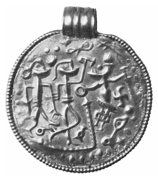 Det er sikkert dette og lignende motiver, der ligger bag de nordiske fremstillinger på B-brakteaterne. Heroppe i det fjerne Norden havde man vist kun tågede forestillinger om kejseren i Rom, om overhovedet nogen. Men mønterne selv besad man jo, og de uvante billeder fristede vel til efterligning. Imidlertid arbejdede man i Norden med andre kunstneriske forudsætninger end i det civiliserede Rom. Guldsmeden omformede figurerne med selvstændig fantasi, og således som landets aftagere var vant til at se den nationale kunst udfolde sig. På denne baggrund er da den romerske kejsermønts hyldningsscene blevet omformet i nordisk ånd. På den fynske brakteat har vi fået et kampoptrin i stedet for den romerske sejrsceremoni. Skal man altså neppe i brakteaten på fig. 2 se noget mytologisk optrin gengivet, har dog smykket i sig selv nok været opfattet som en genstand med magisk iboende kraft. Den beskyttede sin bærer, og andre lignende fik i mange tilfælde sin værnekraft øget ved ondtafværgende runer indslået langs randen.
