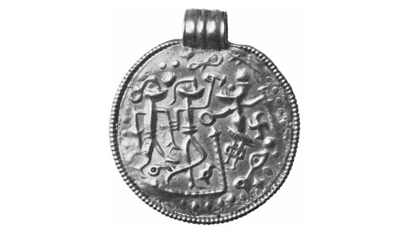På billedet får man i forstørrelsen et klart indtryk af den ensidigt prægede plade og dens udsmykning. I et metalstempel, en kort cylinder, formentlig af bronze, har man først indgraveret den negative 3 cm brede billedflade. Siden lagde man stemplet ned mod et blødere understempel, af bly eller træ, og slog med et eller flere slag stemplets præg ind i den mellemlagte guldplade. Efter prægningen har guldsmeden efterglattet den tynde kant og styrket og prydet denne ved pålodning af en lidt tykkere perlerand. Foroven til denne blev endvidere påloddet en bred profileret øsken til stykkets bæresnor. Ved øskenen ses tydelige spor af slid.