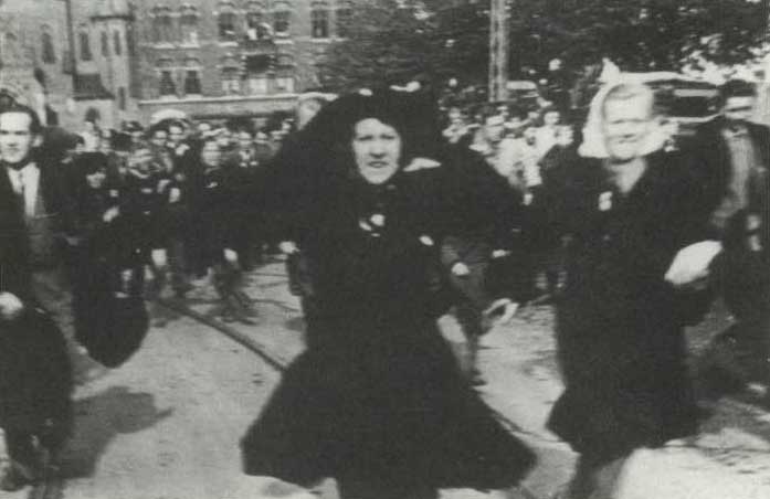 50.000 eller endnu flere langs gader, ved vinduer og på tage over Flakhaven og Klingenberg. Flakhaven var som et kirkerum med levende mure og den lyseblå forårshimmel som hvælving over menneskemængden"[14].