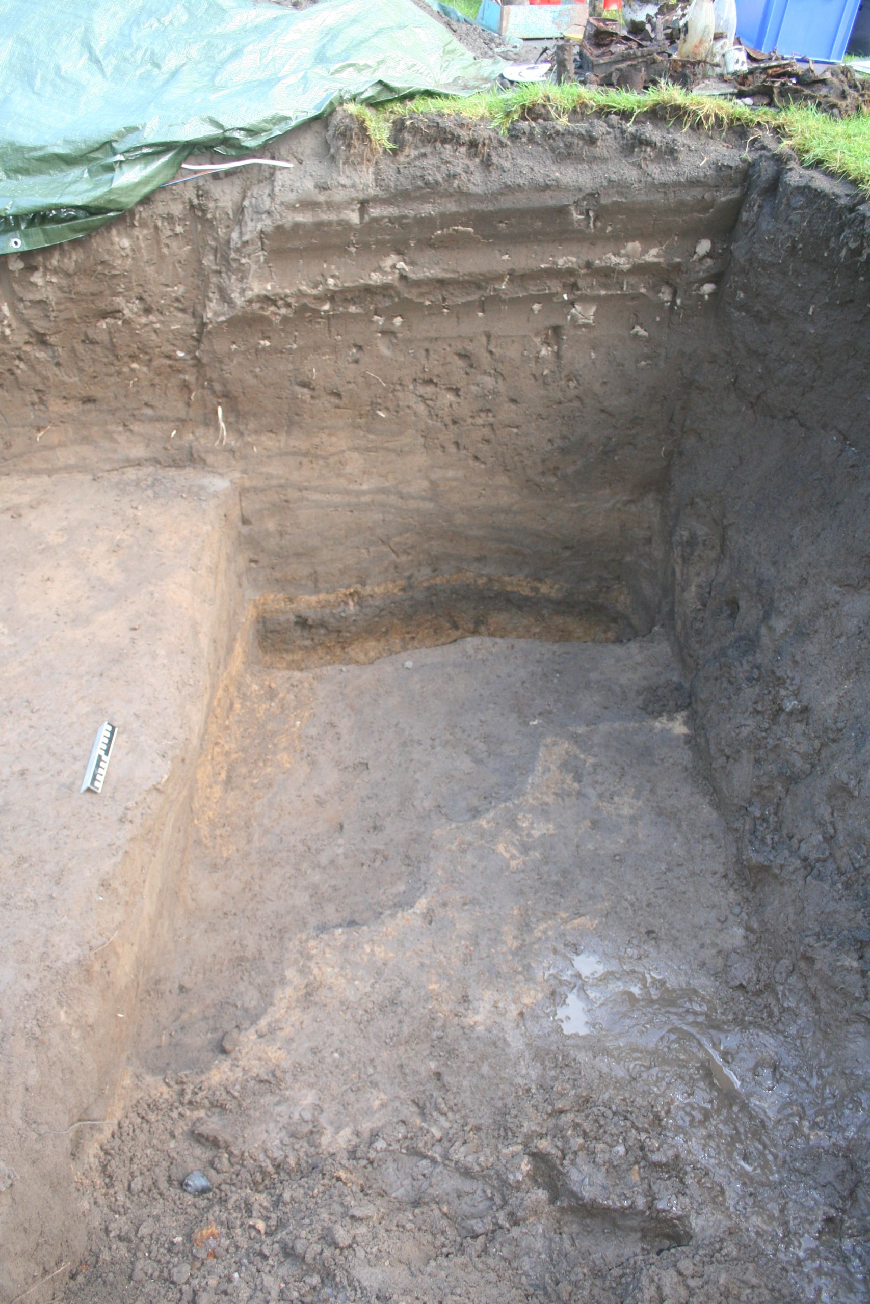 Selv om man siger, at portene på ringborgene ligger i verdenshjørnerne, er det faktisk ikke helt korrekt. For ved alle borge ses der en lille drejning mod enten vest eller øst. Ved Nonnebakken var det muligt at komme til at grave i området for den potentielle nordport. Ved at måle 90 grader ud fra øst- og vest-åbningerne på 1785-kortet blev det formodede sted for nordporten markeret. Her blev en maskingravet grøft trukket øst-vest, og i den orange råjord fremkom da også en række stolpehuller og andre anlæg (fig. 5). Desværre viste det sig, at selve volden var fjernet på dette sted; ja, faktisk genså vi her for første gang den afgravning, som entreprenørholdet fra 1909 havde foretaget. Afgravningen viste sig at have fjernet såvel selve volden som ca. 1-1,5 meter af jorden under denne. Til gengæld havde man holdt sig fuldstændig til området, hvor volden havde stået. Alle anlæg fra voldens inderside og ind mod borgfladen stod helt urørte.