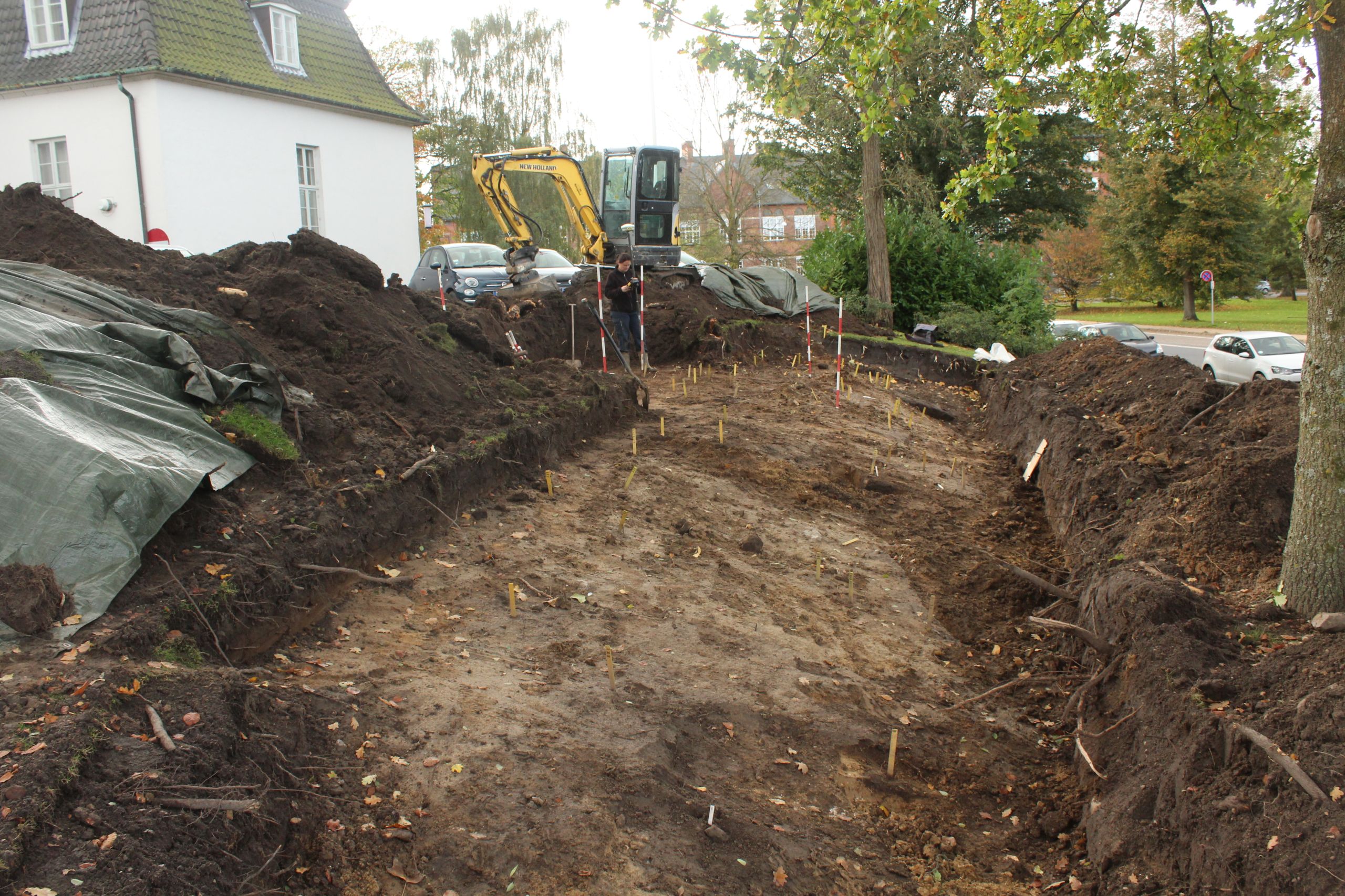 Volden og dens træfacader kunne ses, voldgraven ligeså, og placeringen af den nordlige port kunne underbygges ud fra et større område, end udgravningen i 2017 kunne påvise (fig. 8). Men mest interessant var det, at der på borgfladen kunne ses spor af formodede huse, der placerede sig i karréer som på Harald Blåtands andre ringborge. Dette var en decideret sensation, for siden det for ca. 70 år siden blev foreslået, at Nonnebakken var en af Haralds ringborge, har man uden held jagtet den markante karrébebyggelse på borgfladen. Nu stod vi pludselig med gode indikationer på, at husene havde været der.