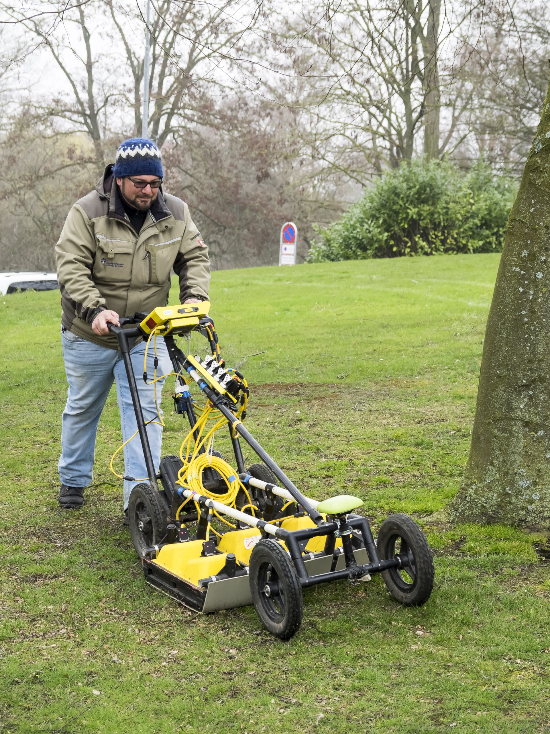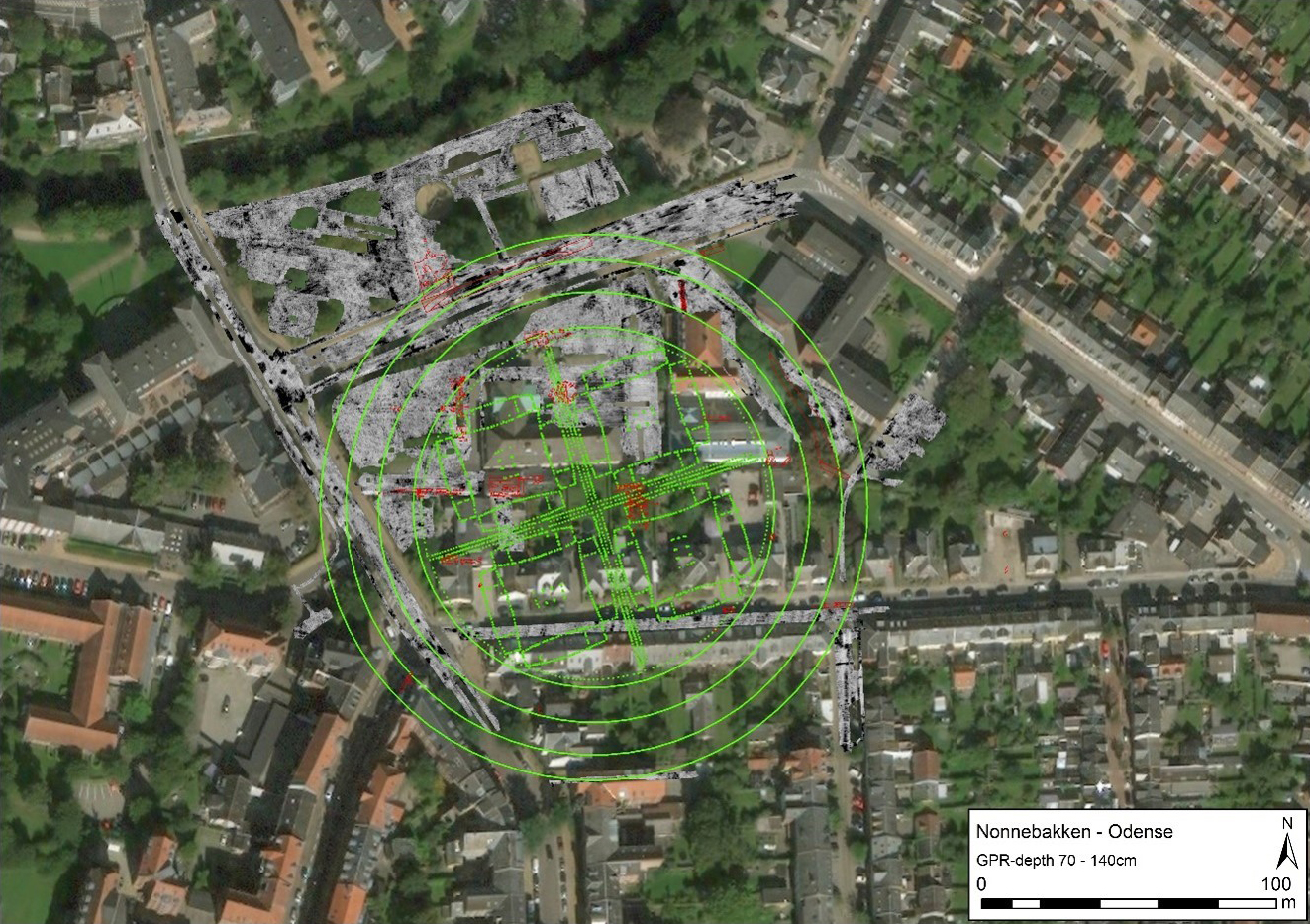 Ved Nonnebakken-undersøgelsen anvendtes jordradar (fig. 6). Radaren scanner jorden i 5 cm tykke lag ned til ca. 3 meters dybde og kan påvise nedgravninger, større sten og andre elementer, som kan tænkes at være skabt af mennesker. Undersøgelserne foregår ved, at man kører over området i en traktorlignende maskine med en række antenner spændt foran eller går rundt med antennerne foran en mindre, plæneklipperlignende maskine. Undersøgelserne genererer en række sort/hvide billeder, hvor forskellige anomalier tegner sig, og via særlig software og eksperternes viden kan resultatet tolkes sammen til strukturer som huse, grave, volde m.v. [9]