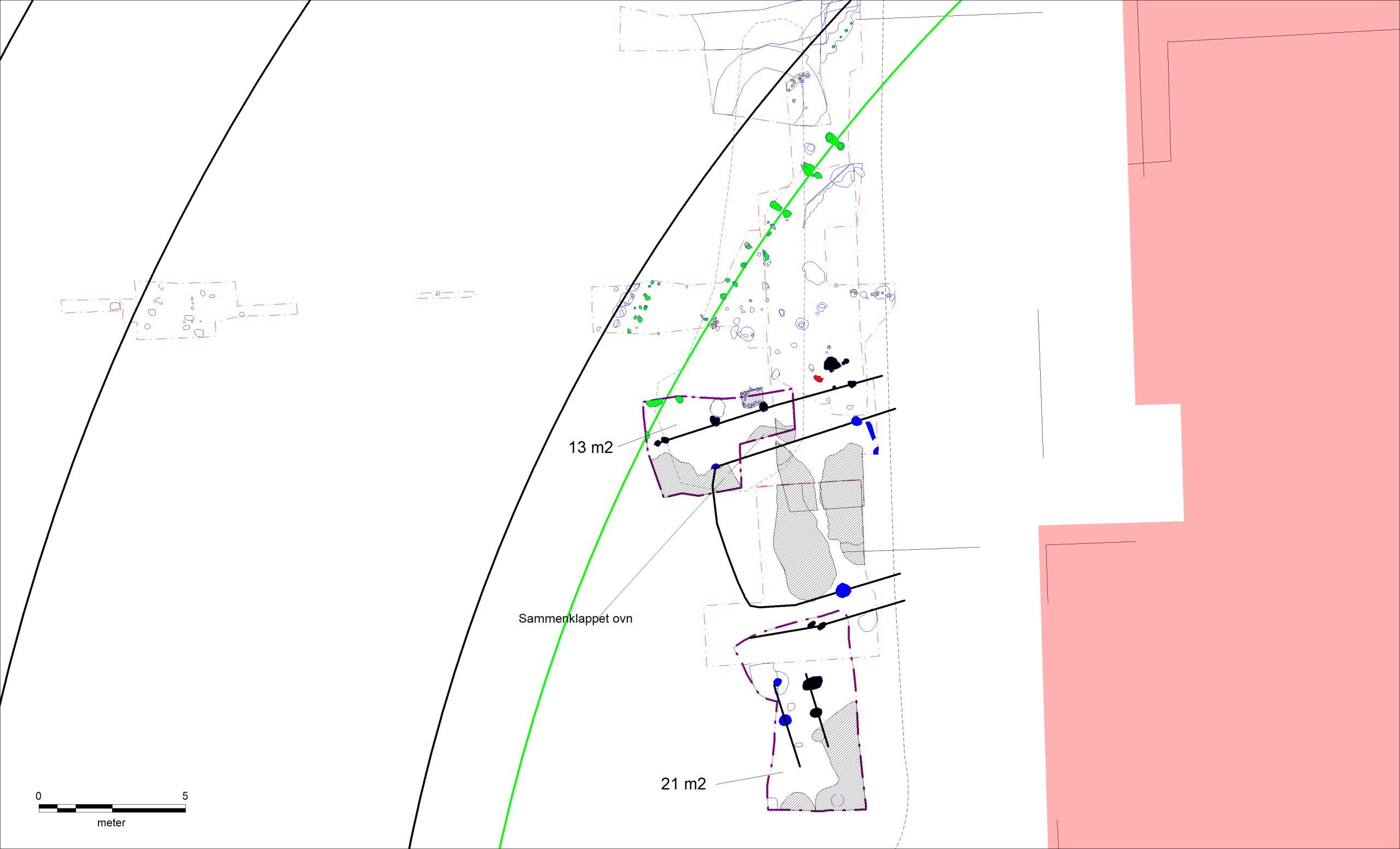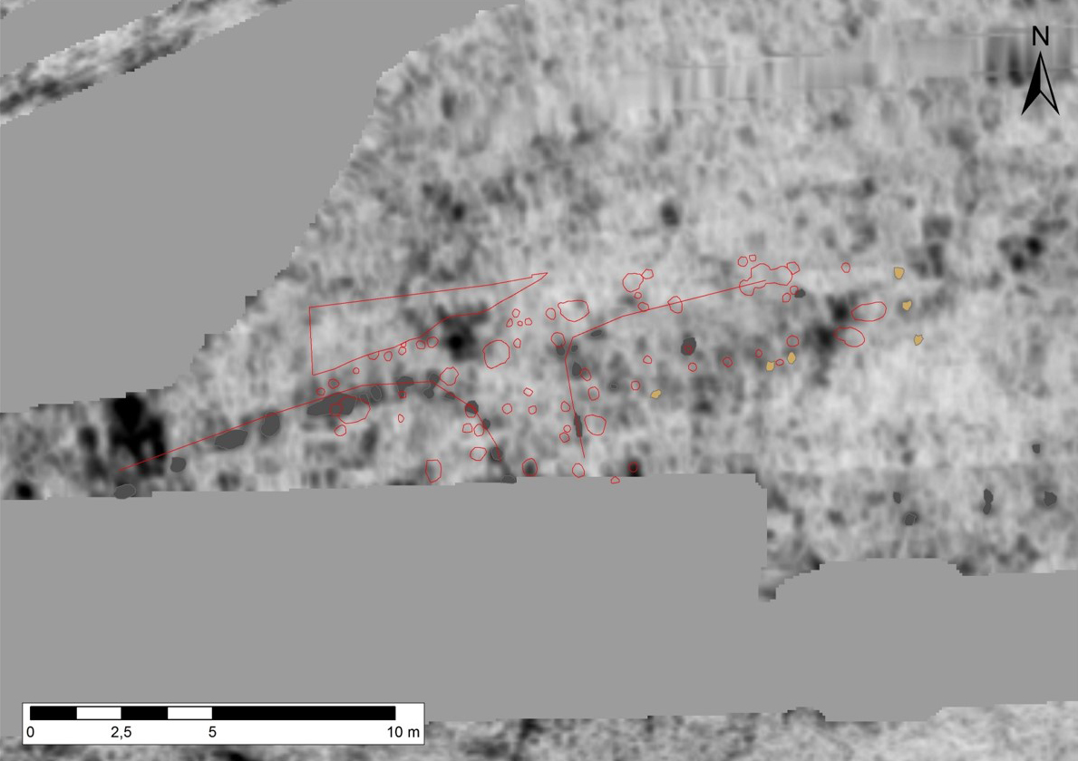 Et tredje væsentligt resultat var fremkomsten i nordfeltet af enkelte stolpehuller, der svarede til dem, som på scanningerne tolkedes som dele af vestgavlen i et øst-vest-orienteret hus i den omtalte karrébebyggelse. Med den nye viden fra scanningerne kunne enkelte markante stolpehuller fra udgravningen i 2015, umiddelbart øst for 2019-feltet, nu også anvendes i konstruktionen af huset. To af disse stolpehuller er C14-dateret til perioden omkring 980 e.Kr.; altså borgens formodede anlæggelsestidspunkt. Ligeledes kunne en lille sølvskat fra 2015, dateret til anden halvdel af 900-tallet, med den nye viden indplaceres ved nordsiden af huset; en typisk placering af et skattefund i en bopladssammenhæng. Et par stolpehuller i sydfeltet kan muligvis udgøre dele af østsiden af et andet hus i karrébebyggelsen, men her er sporene så få, at en entydig tolkning ikke er mulig (fig. 10). Overensstemmelsen mellem jordradarens og udgravningens resultater betyder, at de øvrige spor, som scanningerne viste, med stor sandsynlighed også må formodes at være korrekte.