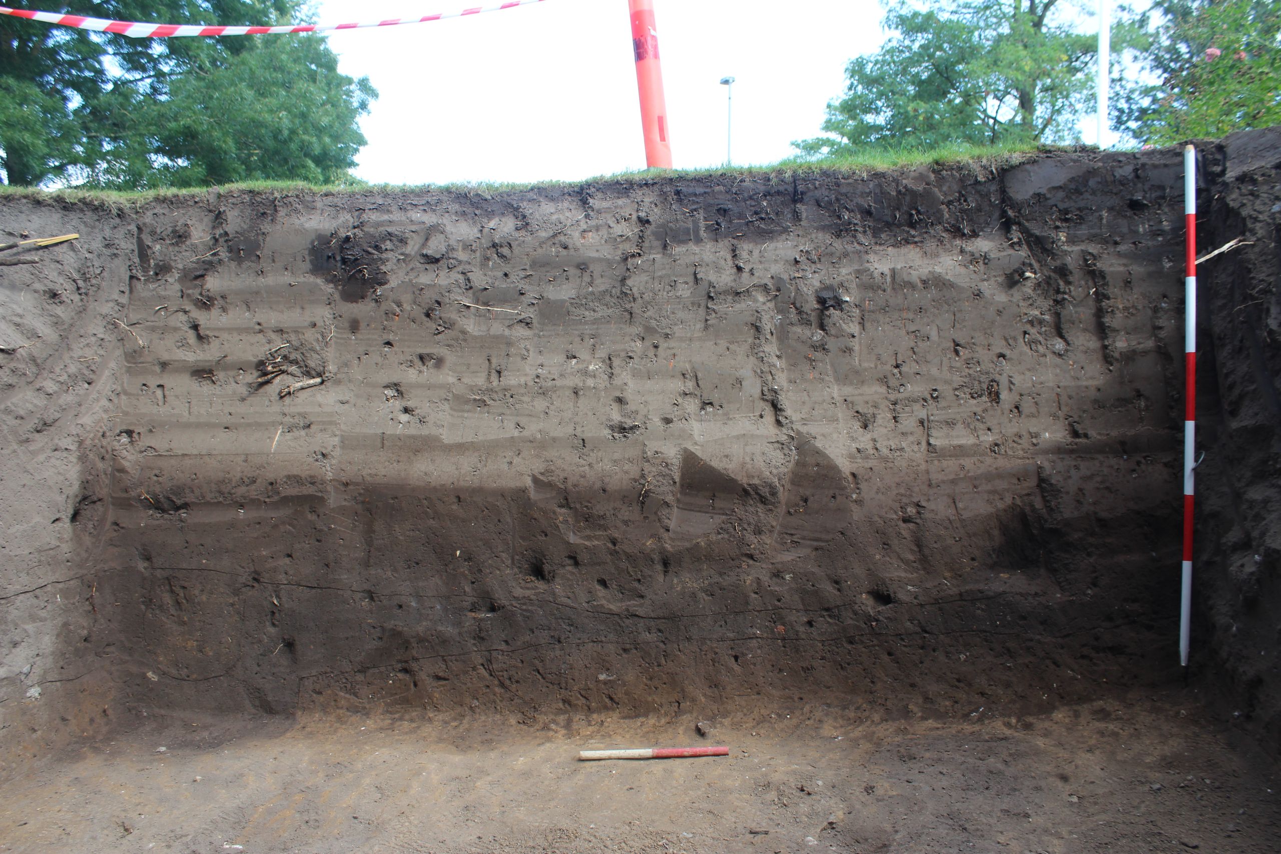Nonnebakken er et fredet fortidsminde, og der skal søges om tilladelse til udførelse af alle jordarbejder ved Slots- og Kulturstyrelsen; det gælder også arkæologiske undersøgelser. Med afsæt i et forskningsprojekt om Odenses opståen[6] fik museet i 2015 mulighed for at foretage en mindre udgravning i den nordvestlige del af borgen. Undersøgelsen blev et regulært gennembrud for opfattelsen af Nonnebakken. For på dette sted var borgen langt bedre bevaret, end vi havde forestillet os. Den tørveopbyggede vold stod i næsten 1 meters højde, og borgfladen, hvor vikingerne har gået rundt, lå næsten 1,5-2 meter under nuværende terræn godt beskyttet af tykke opfyldningslag (fig. 4). De gode bevaringsforhold betød, at stolpehuller og andre anlæg stod meget tydeligt frem, og nye træk ved borgen kunne erkendes. Det gælder bl.a. en ringgade på indersiden af volden samt påvisningen af nye detaljer vedr. voldens opførelse.[7] Med ét var Nonnebakken gået fra at være et formodet, næsten totaldestrueret fortidsminde til at udgøre et anlæg med yderst stort forsknings- og formidlings-potentiale.